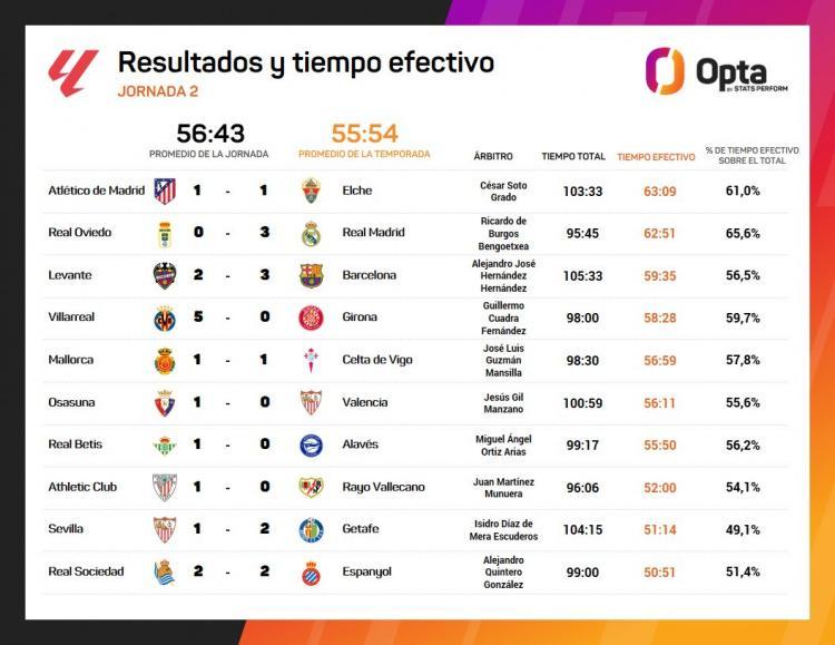 直播吧8月26日讯 Opta统计了西甲第二轮的净比赛时间,马竞vs埃尔切净比赛时间63分09秒最长,皇家奥维耶多vs皇马、莱万特vs巴萨二三位。