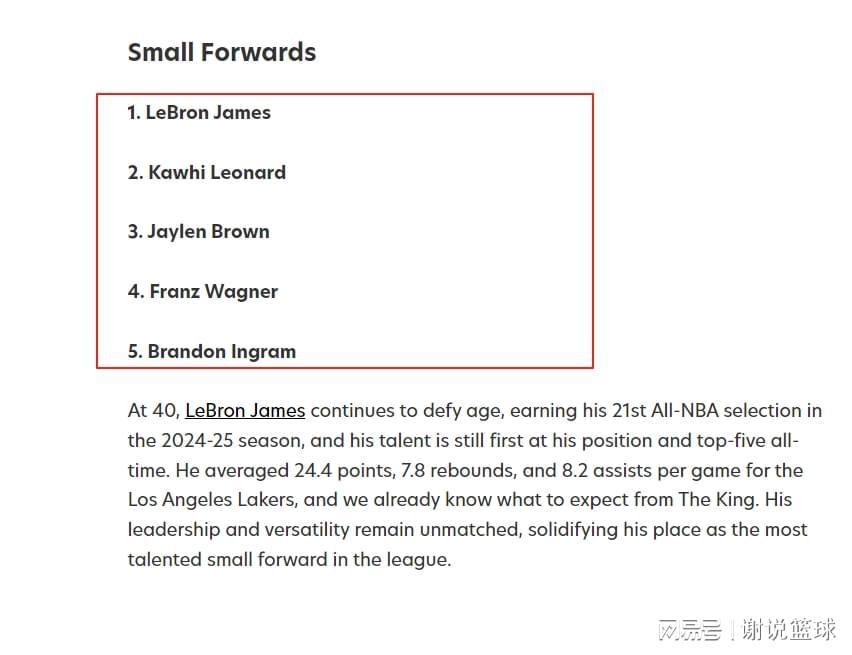 在相对平静的休赛期,媒体评选出了现役最具实力的五大小前锋。这份榜单不仅考量球员当前表现,更看重他们的天赋潜力。最终勒布朗·詹姆斯力压群雄位居榜首,科怀·伦纳德紧随其后,杰伦·布朗和弗朗茨·瓦格纳分列三四位,而布兰登·英格拉姆则位列第五。