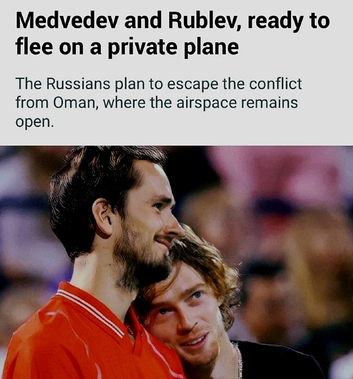 还没有逃离迪拜的俄罗斯名将梅德维德夫和卢布列夫目前还都在签表之中。有外媒报道,称俄罗斯两兄弟已经选择了一条走陆路离开迪拜的路线,计划先到阿曼,然后乘私人飞机转道土耳其再飞往印第安维尔斯。但愿他们安全脱身,也希望其他滞留在迪拜的球员也能安全撤离。