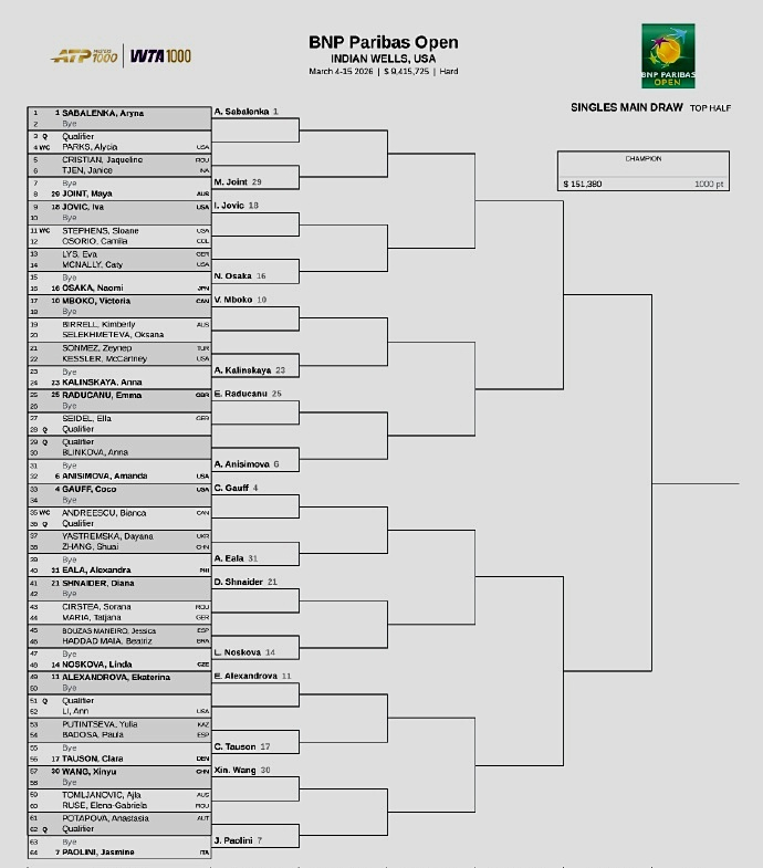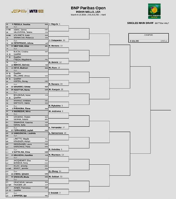 女子方面:前八大种子的对位是,上半区,萨巴伦卡--阿尼西莫娃、高芙--鲍里妮;下半区,佩古拉--莱巴金娜、米拉-安德列娃--斯瓦泰克。中国一姐郑钦文位列24号种子,首轮轮空,第二轮将静候复出的美国人布雷迪和克罗地亚人鲁季奇之间的胜者。如能晋级,第三轮将对阵捷克名将穆霍娃,第四轮等待她的大概率是2号种子、世界第二斯瓦泰克,签表够硬。
