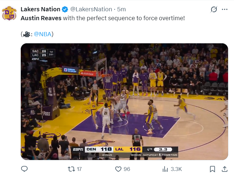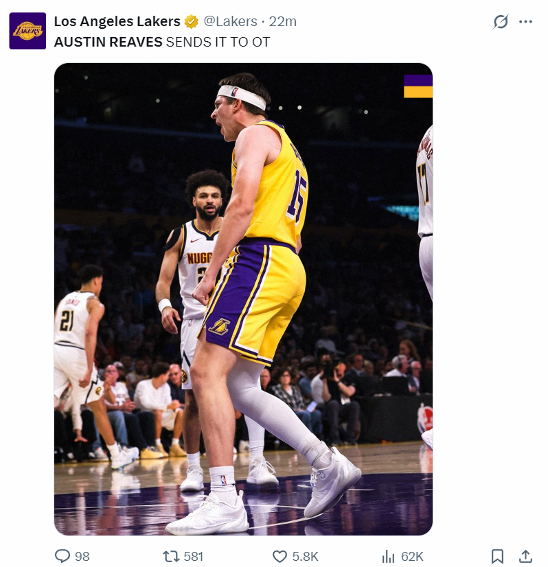 里夫斯在最后时刻的表现直接登上了全美第一热搜,虽然里夫斯两个低级失误是湖人队决胜时刻落后的关键,可他在关键的两罚一中(故意不中)+自己拼下前场篮板抛投绝平。
