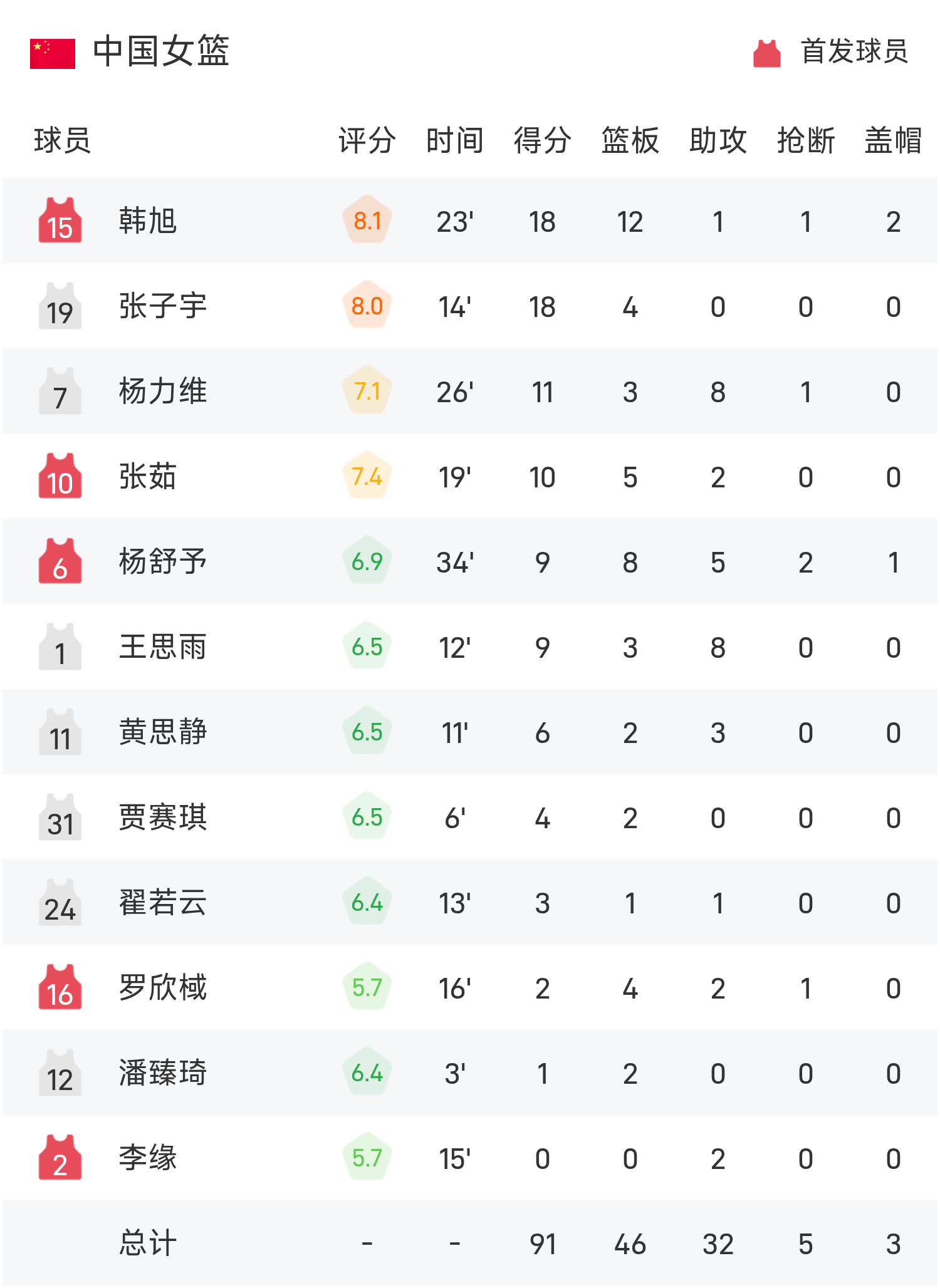 07月15日讯 女亚洲杯小组赛,韩国女篮对阵中国女篮。双方全场战罢,韩国女篮69-91不敌中国女篮。韩旭砍下全场最高的18分12板1助,率领中国女篮成功取胜。